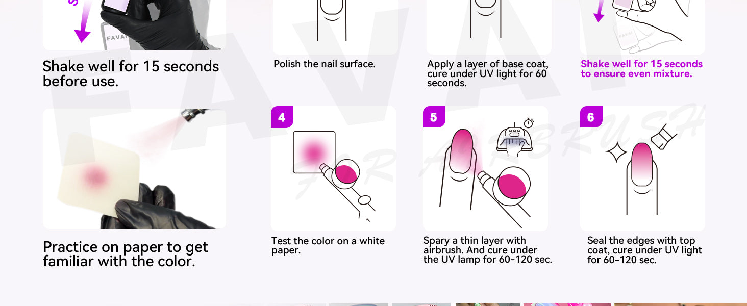 ***より濃い色が必要な場合は、ネイルライトで硬化させた後、1~2回繰り返しスプレーし、再度ネイルライトで硬化させてください。***