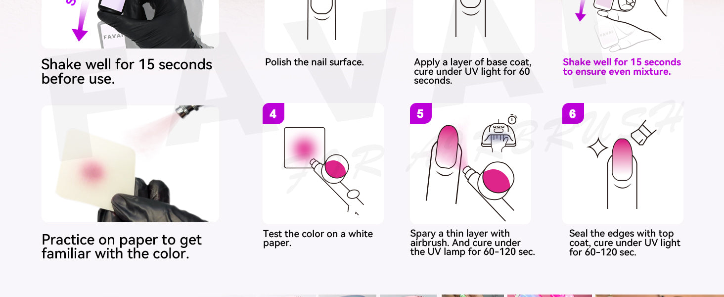 ***より濃い色味をご希望の場合は、ネイルライトで硬化後、1~2回繰り返しスプレーし、再度ネイルライトで硬化させてください***