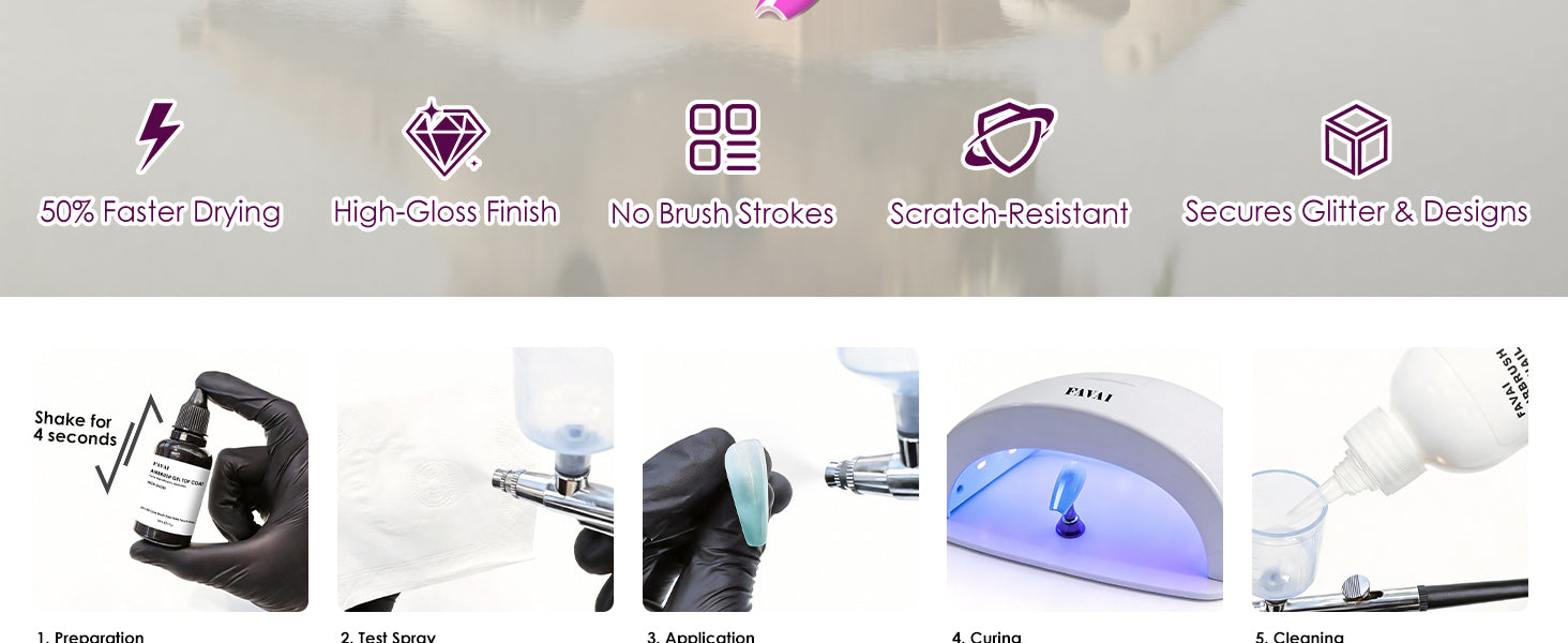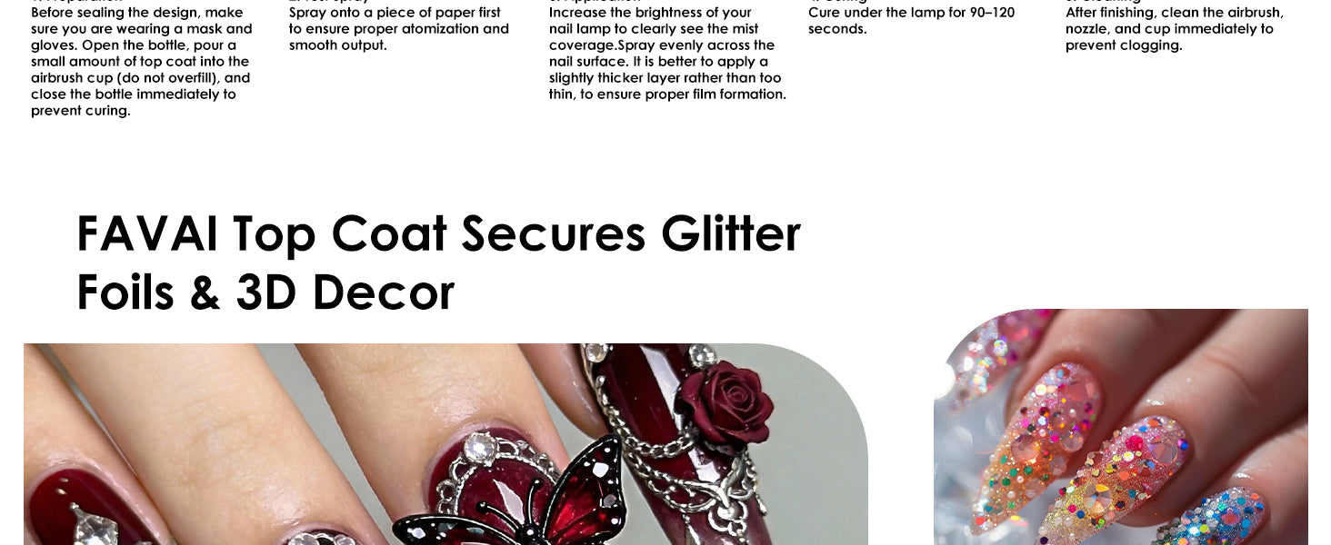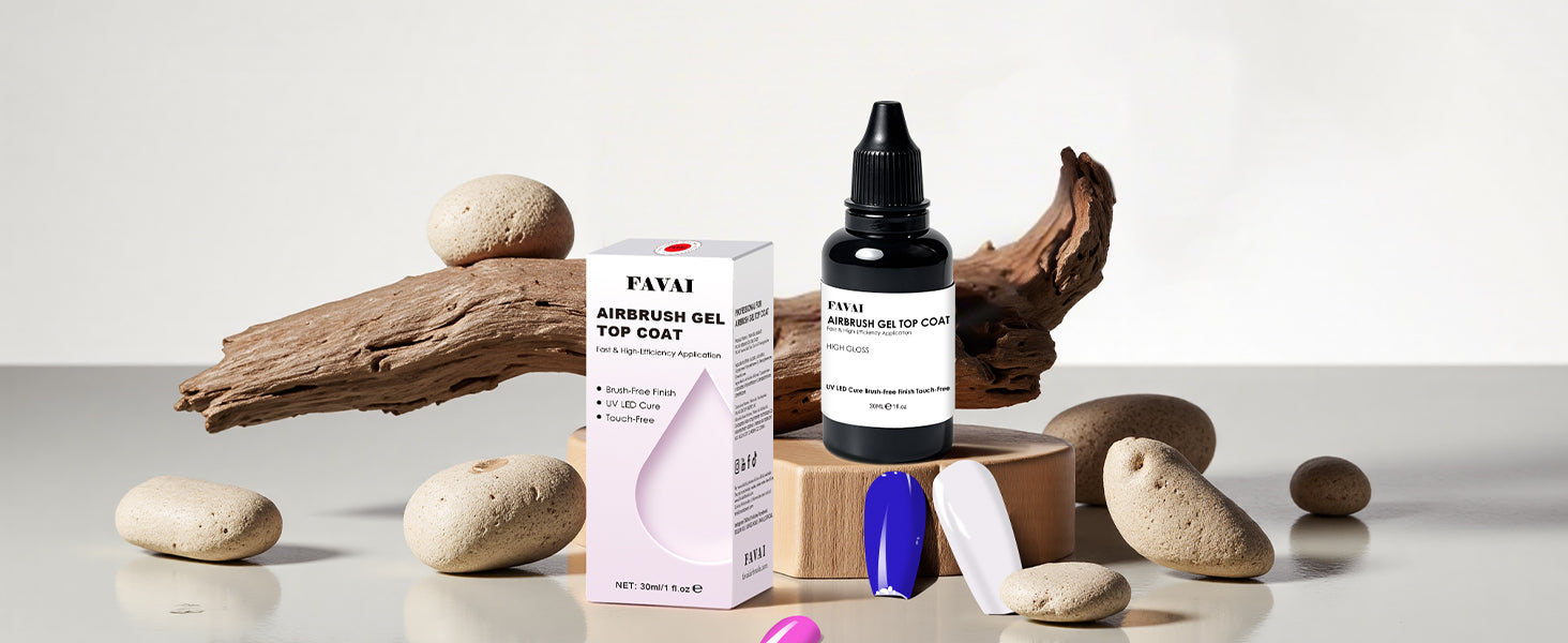 Long-lasting Top Coat Gel FAVAI clear airbrush gel top coat can make your gel last for over 30 days with a proper application due to its wear-resistant feature. Flexible no wipe top coat airbrush gel nail polish leaves a gorgeous glossy finish that lasts longer, doesn’t chip or scratch.